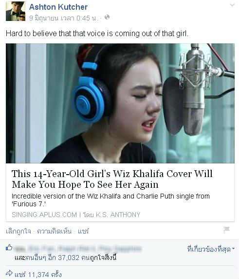 (http://www.dek-d.com/board/view/3520114/)ตั้งแต่เพจ Ashton Kutcher ดาราฮอลลีวู้ดชื่อดังที่มีคนติดตามกว่า 17 ล้านคนทั่วโลก เริ่มแชร์วีดีโอเพลงคัฟเวอร์ "See You Again" ของสาวน้อยร้อยล้านวิว พลอยชมพู (Jannine Weigel) เมื่อวันที่ 9 มิ.ย. มีเสียงตอบรับมากมายจากชาวอเมริกัน ถึงความสามารถและอารมณ์เพลงที่ถ่ายทอดออกมา